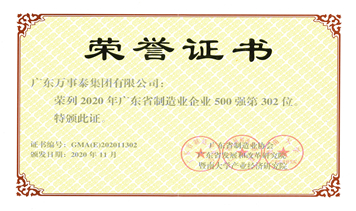「喜訊」萬事泰集團榮列2020年廣東省制造業(yè)企業(yè)500強推薦