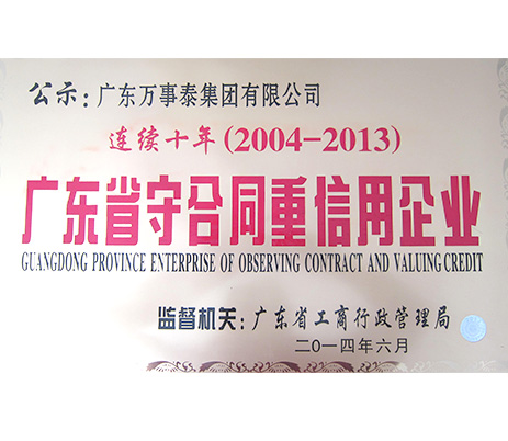 今年,我縣在網(wǎng)上申報公示守合同重信用的企業(yè),萬事泰集團(tuán)通過考核獲得2013年度“廣東省守合同重信用企業(yè)”連續(xù)10年的稱號。