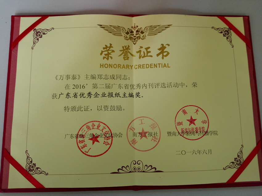 廣東省優(yōu)秀企業(yè)報(bào)紙主編獎(jiǎng)。