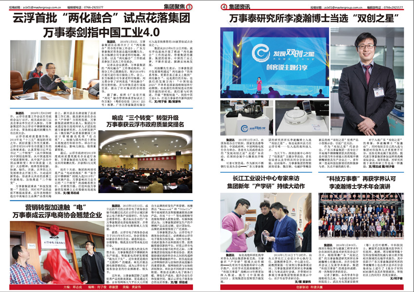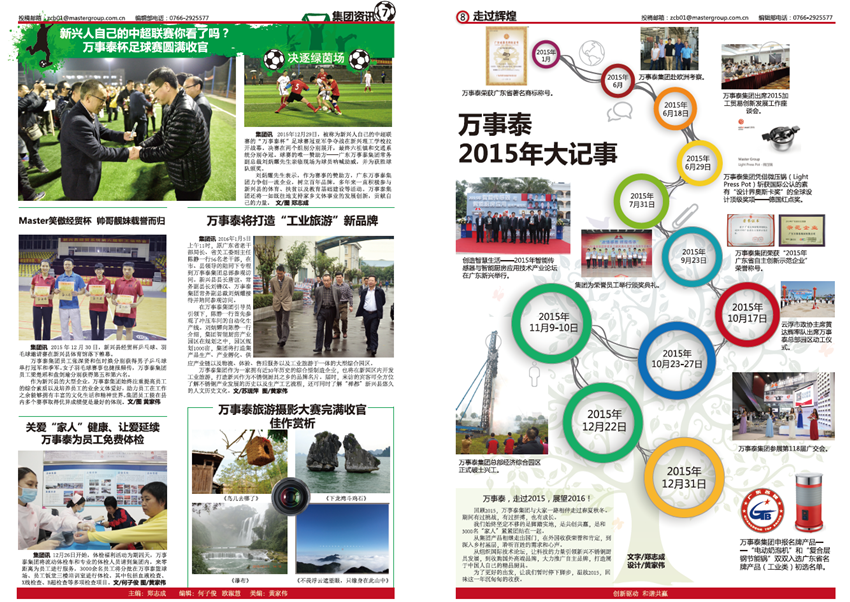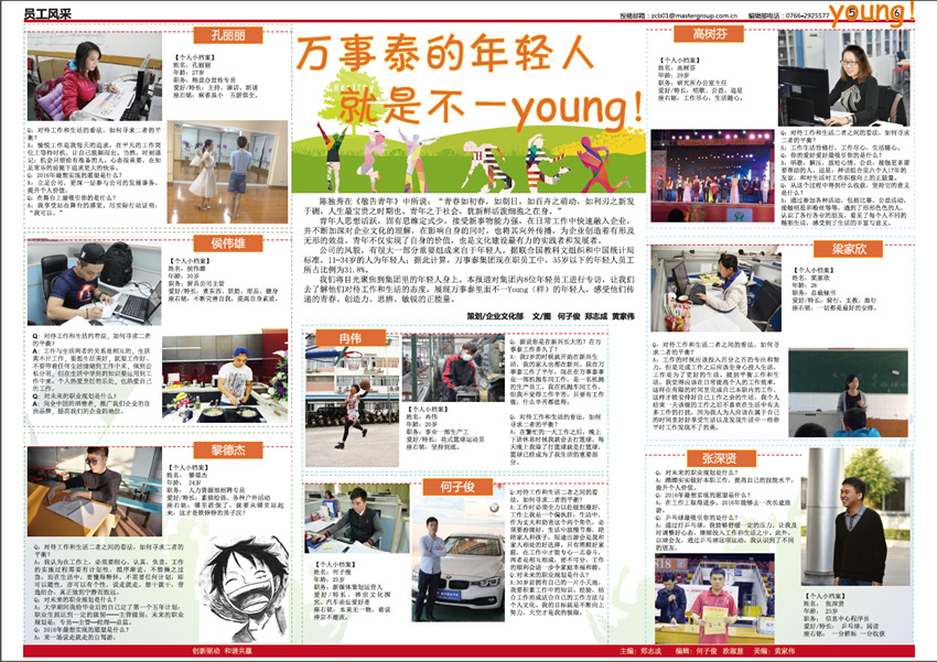 《萬事泰》是廣東萬事泰集團(tuán)的企業(yè)月報(bào),由集團(tuán)企業(yè)文化部負(fù)責(zé)編輯出版,在部門同事鄭志成、歐淑慧、何子俊、黃家偉、黎家良的協(xié)作努力下,在集團(tuán)領(lǐng)導(dǎo)、員工的鞭策和支持下,不斷將內(nèi)刊從選題策劃、欄目設(shè)置、稿件標(biāo)準(zhǔn)、版式設(shè)計(jì)上進(jìn)行升級改進(jìn),為廣大萬事泰員工奉獻(xiàn)一份“從一線來、到一線去”的接地氣的內(nèi)刊報(bào)紙,建設(shè)成企業(yè)內(nèi)部資訊上傳下達(dá)的暢通平臺,傳遞實(shí)用有趣、積極向上的資訊內(nèi)容和集團(tuán)理念,助力集團(tuán)的蓬勃發(fā)展。