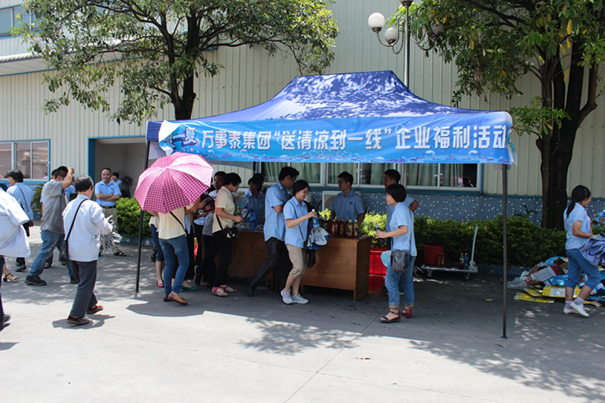 當(dāng)天下午1時(shí)許,集團(tuán)總部中門、事業(yè)二部門口,兩個(gè)藍(lán)色的帳篷,“萬事泰集團(tuán)送清涼到一線企業(yè)福利活動(dòng)”橫幅醒目顯眼,在高溫天氣里營(yíng)造了涼爽的氛圍。近5000支不同品類的瓶裝飲料已在冰塊水桶里冰鎮(zhèn)起來,集團(tuán)訂制的便攜小扇子也整齊擺放,靜候上班的員工到來??偛棉k主任梁賢武、行政部副經(jīng)理陳煥文、工會(huì)主席梁洪光等集團(tuán)管理層親自上陣,為辛苦勤奮的一線員工親自送上一瓶冰鎮(zhèn)飲料,道一聲“您辛苦了,清涼一下!”上班時(shí)間一到,一線員工們排成整齊的隊(duì)伍領(lǐng)取集團(tuán)發(fā)放的冰鎮(zhèn)飲料,拿著印有集團(tuán)品牌和解暑小常識(shí)的扇子,開心走向各自的崗位。