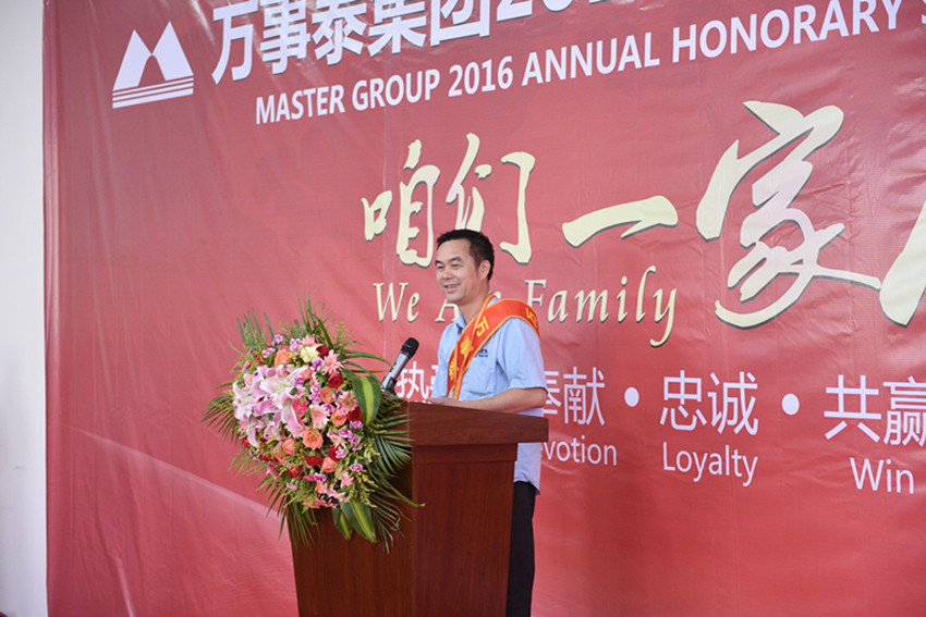 當天下午4點30分,頒獎典禮緩緩拉開序幕。執(zhí)行總裁劉總致辭,他說道:這是集團家人們一年一度的團聚,讓我們在拼搏的日子里不忘初心,坐下來聊聊,過去的成長與收獲,從而再次精神飽滿地出發(fā)。萬事泰集團從成立、發(fā)展壯大至今,二十余年風雨兼程,在座的各位榮譽員工,是萬事泰成就輝煌的參與者、見證者,集團的每一個成就、每一次突破,都凝結著你們的青春、智慧和汗水。集團奉行“以人為本”,堅持人才戰(zhàn)略,每一位把青春、智慧和忠誠奉獻給萬事泰的榮譽員工,都是集團最寶貴的財富。你們多年始終如一、矢志不渝,勤奮、拼搏、務實、忠誠、細心等優(yōu)秀可貴的品質,就是對“工匠精神”的完美詮釋。萬事泰因為有你們添磚加瓦而越加精彩卓越,我希望各位榮譽員工能在各自的崗位上守土有責,做好楷模表率,影響帶動年輕人,傳承發(fā)展“萬事泰精神”,與集團一同譜寫新的篇章。