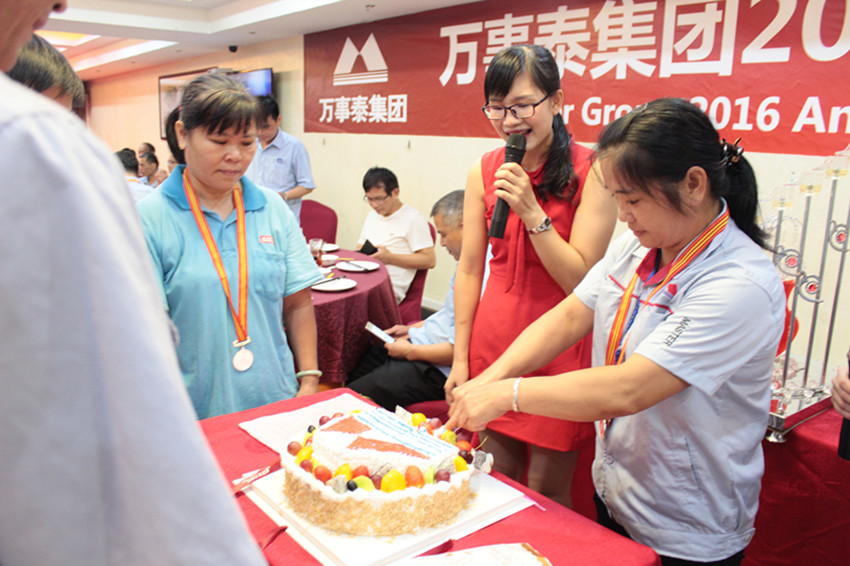 晚宴開始前,最特殊溫情的環(huán)節(jié)出現(xiàn)了!集團為8月生日的新晉榮譽員工慶賀生日,四位當月過生日的老員工十分驚喜,在現(xiàn)場感動得眼眶濕潤。一位員工表示,這是她度過最特別最難忘的一個生日,在萬事泰工作了十多年,心里很溫暖,家的溫暖,親人的溫暖,是支持她在這里扎根的重要原因。