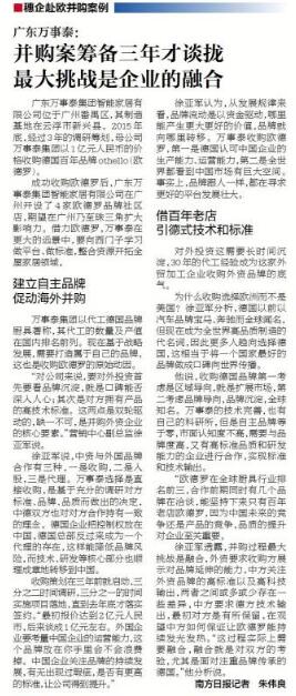 他說,收購德國品牌第一考慮是區(qū)域?qū)?,就是擴(kuò)展市場,第二考慮品牌導(dǎo)向,品牌沉淀,全球知名。萬事泰的技術(shù)完善,也有自己的科研所,但是自主品牌等于零,市面認(rèn)知度不高,需要與品牌度高,又有高標(biāo)準(zhǔn)品質(zhì)和研發(fā)能力的企業(yè)進(jìn)行合作,實(shí)現(xiàn)標(biāo)準(zhǔn)和技術(shù)輸出。