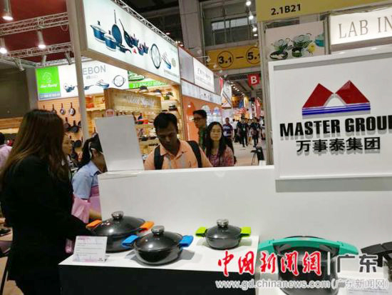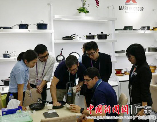 記者在廣交會上看到,膚色不同的國外采購商對廣東萬事泰集團(tuán)展區(qū)豐富的不銹鋼餐廚具產(chǎn)品頗感興趣,現(xiàn)場咨詢、下單者絡(luò)繹不絕。