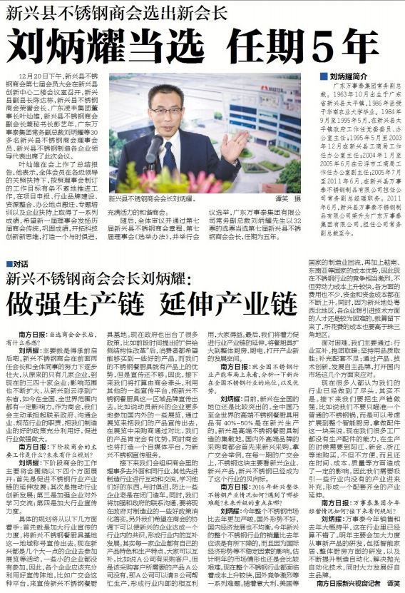 2016年12月20日下午3時(shí)許,新興縣不銹鋼商會(huì)第七屆會(huì)員大會(huì)在新興縣創(chuàng)新中心二樓會(huì)議室日常召開,新興縣副縣長(zhǎng)陳達(dá)棟,新興縣不銹鋼商會(huì)榮譽(yù)會(huì)長(zhǎng)、廣東凌豐集團(tuán)董事長(zhǎng)葉燦雄,新興縣不銹鋼商會(huì)副會(huì)長(zhǎng)兼秘書長(zhǎng)彭藝年、副秘書長(zhǎng)馮婉萍,廣東萬(wàn)事泰集團(tuán)常務(wù)副總裁劉炳耀等30多名新興縣不銹鋼商會(huì)理事會(huì)員、新興縣不銹鋼制造各企業(yè)領(lǐng)導(dǎo)代表出席會(huì)議。