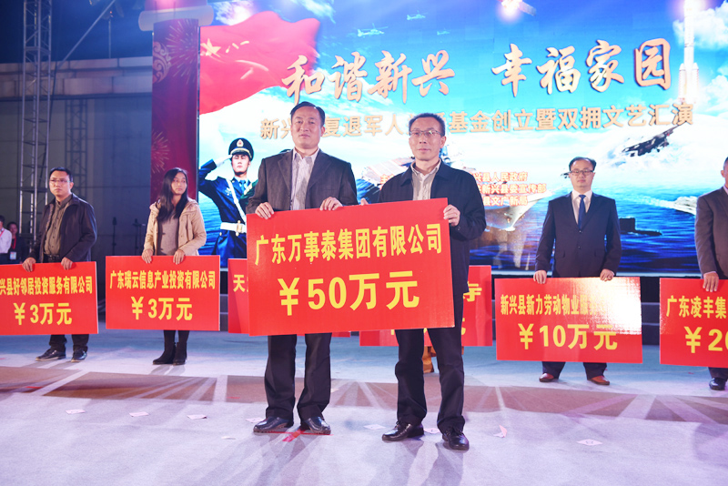 集團訊 1月5日晚上,在新興縣文化廣場隆重舉行了新興縣復(fù)退軍人關(guān)愛基金創(chuàng)立暨雙擁文藝匯演。市委副書記、政法委書記袁錦權(quán),市人大常委會副主任梁錦波,副市長鐘漢謀、市政協(xié)副主席王莉莉,縣委書記唐誼,縣委副書記、縣長梁子財,縣人大主任梁錦釗,縣政協(xié)主席梁國華、萬事泰集團常務(wù)副總裁劉炳耀等愛心企業(yè)家出席了此次盛會。