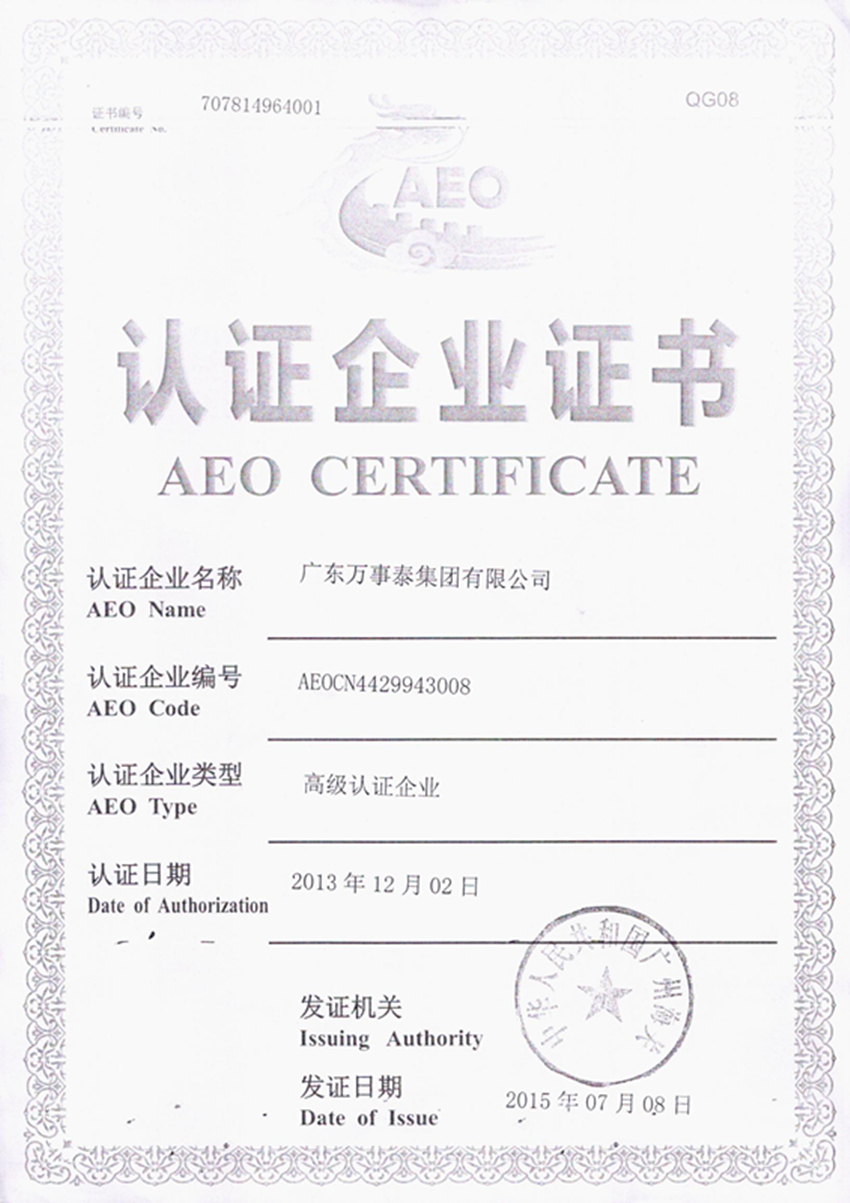 集團(tuán)訊 近日,萬事泰集團(tuán)順利通過海關(guān)AEO(即Authorized Economic Operator,簡(jiǎn)稱“經(jīng)認(rèn)證經(jīng)營(yíng)者”)高級(jí)認(rèn)證、成為獲得國(guó)際貿(mào)易最高等級(jí)“信用通行證”的企業(yè)。