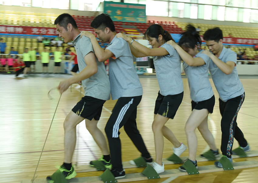 在裁判長的一聲“哨”令下,六項比賽項目井然有序地開展起來。在“齊心協(xié)力”的比賽中,萬事泰集團(tuán)員工們的表現(xiàn)最為突出,只見5名隊員列成一排,雙腳站在協(xié)力競走器上,順著“一二、一二...”的口號拍子,同心協(xié)力地向著起點的另一邊奮進(jìn)。