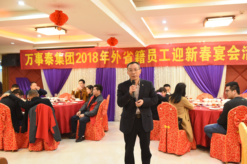 集團(tuán)訊 新春佳節(jié)將至,2月10日晚,萬事泰舉辦了2018年外省籍員工迎新春宴會(huì)活動(dòng)。萬事泰集團(tuán)常務(wù)副總裁劉炳耀等集團(tuán)領(lǐng)導(dǎo)出席活動(dòng),并與留在集團(tuán)過年的外省籍員工及家屬共享團(tuán)年飯。