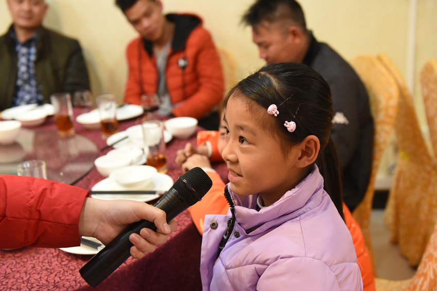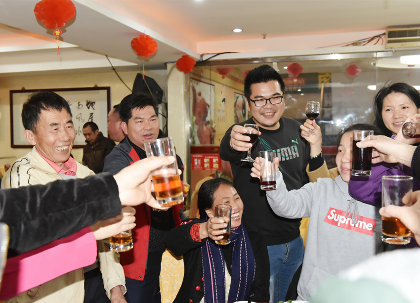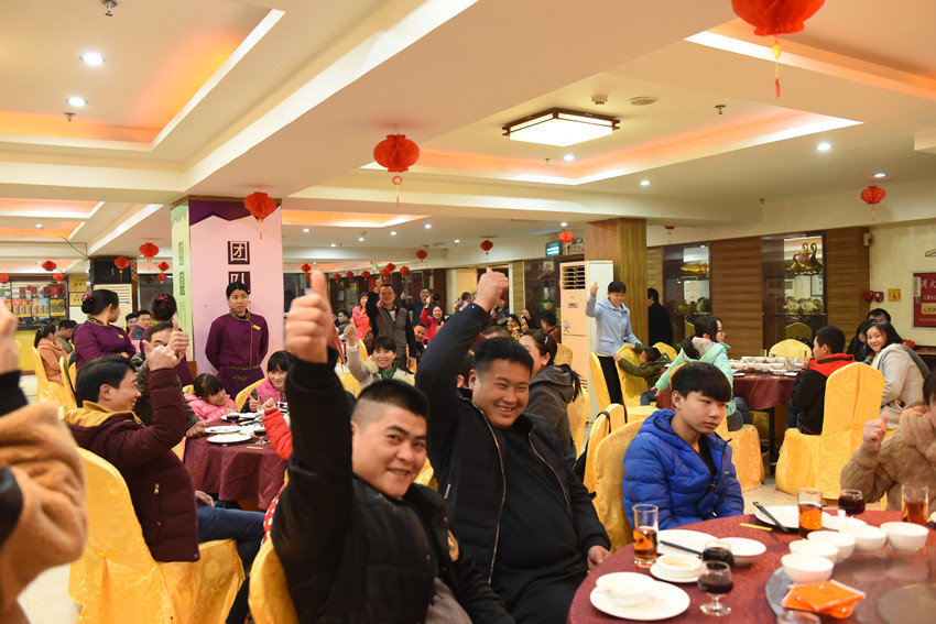 席間,不同鄉(xiāng)音,不同笑臉,相互祝福,共敘濃濃情,同喝美酒,同品佳肴,共迎幸福年,濃濃的年味彌漫在大家的臉上。
