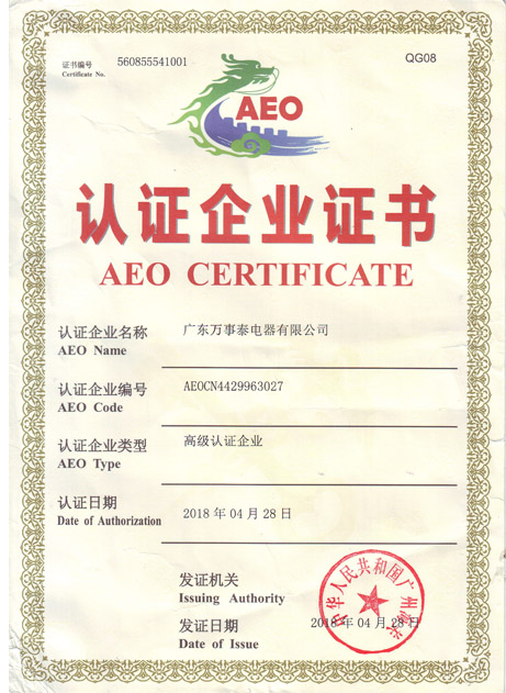 集團(tuán)訊 近日,廣東萬事泰電器公司榮獲AEO高級(jí)認(rèn)證企業(yè)證書,這標(biāo)志著萬事泰電器公司被正式納入海關(guān)高級(jí)認(rèn)證管理體系,成為國際貿(mào)易高級(jí)別“信用通行證”企業(yè),也為萬事泰電器進(jìn)一步做優(yōu)做強(qiáng)海外市場(chǎng)插上了騰飛的翅膀。