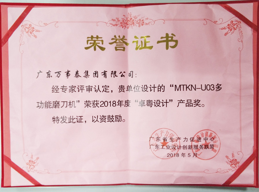 集團(tuán)訊 5月31日,在廣東省生產(chǎn)力促進(jìn)中心主辦的工業(yè)設(shè)計(jì)創(chuàng)新服務(wù)聯(lián)盟大會(huì)上,萬事泰旗下電器公司產(chǎn)品MTKN_U03多功能磨刀機(jī)憑借優(yōu)秀的設(shè)計(jì)和創(chuàng)新的技術(shù)脫穎而出,榮獲“卓粵設(shè)計(jì)”產(chǎn)品獎(jiǎng),這是對(duì)萬事泰設(shè)計(jì)創(chuàng)新水平的高度肯定。
