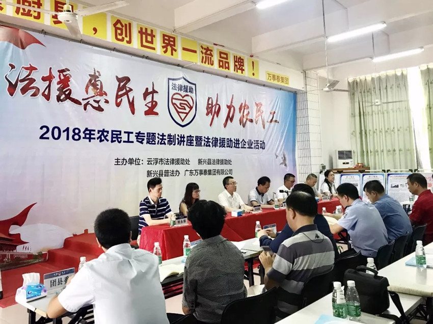 集團(tuán)訊 9月26日,由云浮市法律援助處、新興縣法律援助處、新興縣普法辦、廣東萬事泰集團(tuán)有限公司聯(lián)合開展以“法援惠民生,助力農(nóng)民工”為主題的“2018年農(nóng)民工專題法制講座暨法律援助進(jìn)企業(yè)活動”在萬事泰總部三樓培訓(xùn)室順利舉辦,新興縣副縣長、公安局長譚成、云浮市法援處劉彤主任、縣政法委、法院、檢察院、公安局、司法局、人社局、總工會、婦聯(lián)、團(tuán)委、殘聯(lián)等單位領(lǐng)導(dǎo)出席了本次活動,萬事泰常務(wù)副總裁劉炳耀、總裁辦主任梁賢武、行政部經(jīng)理陳永錦參加了活動。