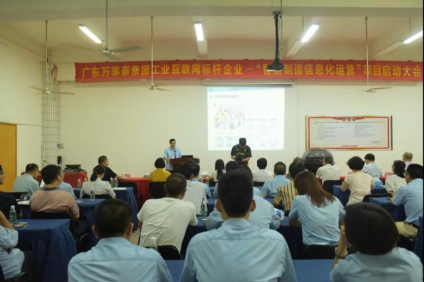 集團(tuán)訊 8月15日,廣東萬(wàn)事泰集團(tuán)工業(yè)互聯(lián)網(wǎng)標(biāo)桿企業(yè)——“智能制造信息化運(yùn)營(yíng)”項(xiàng)目啟動(dòng)大會(huì)在集團(tuán)培訓(xùn)室隆重舉行。云浮市工信局副局長(zhǎng)胡立新、工業(yè)互聯(lián)網(wǎng)科科長(zhǎng)李慧恒、新興縣工信局副局長(zhǎng)劉田英等領(lǐng)導(dǎo)應(yīng)邀出席。萬(wàn)事泰集團(tuán)董事長(zhǎng)梁桂泉、常務(wù)副總裁劉炳耀,以及合作方鼎捷軟件公司營(yíng)運(yùn)長(zhǎng)劉波、總經(jīng)理許嘉易出席了啟動(dòng)大會(huì)。集團(tuán)各部門(mén)負(fù)責(zé)人與項(xiàng)目相關(guān)人員、鼎捷公司專家團(tuán)隊(duì)等100多人共同見(jiàn)證了儀式。會(huì)議由集團(tuán)總裁辦主任梁賢武主持。