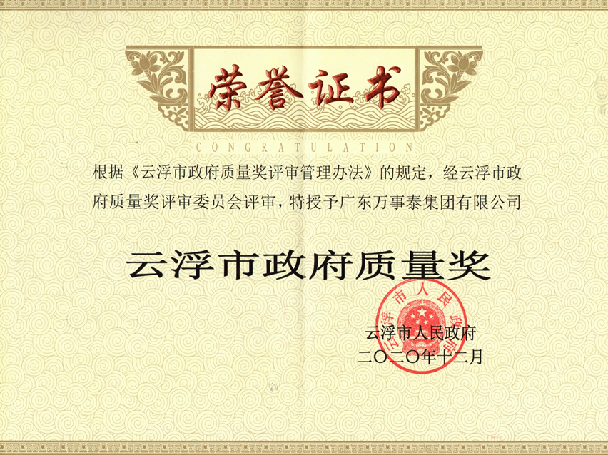 集團(tuán)訊 近日,云浮市政府召開了第四屆云浮市政府質(zhì)量獎評審會議,經(jīng)評審,廣東萬事泰集團(tuán)榮膺“云浮市政府質(zhì)量獎”。獲此榮譽(yù),是社會各界對萬事泰集團(tuán)綜合競爭力、整體管理水平、生產(chǎn)制造能力及高質(zhì)量發(fā)展的充分肯定。