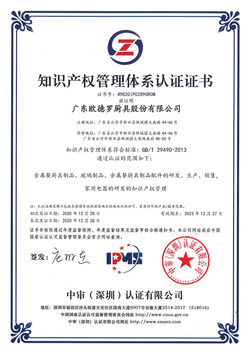 集團(tuán)訊 日前,廣東歐德羅廚具股份有限公司順利通過《企業(yè)知識產(chǎn)權(quán)管理規(guī)范》的認(rèn)證評審,榮獲“知識產(chǎn)權(quán)管理體系認(rèn)證證書”。