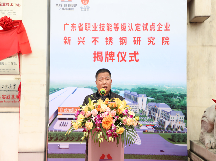 新興縣副縣長伍樹全對萬事泰集團順利通過廣東省職業(yè)技能等級認定試點企業(yè)及成立新興不銹鋼研究院表示祝賀。他指出,“省職業(yè)技能等級認定試點企業(yè)”的榮譽,是對萬事泰集團人才培育工作的極大肯定與認可。希望萬事泰集團發(fā)揮“試點”效用,繼續(xù)加強企業(yè)技能人才隊伍建設(shè),為行業(yè)和社會培養(yǎng)出更多具有專業(yè)技能和創(chuàng)新能力的高水平領(lǐng)軍人才。今天,新興不銹鋼研究院正式掛牌落戶萬事泰集團,依托萬事泰集團,研究院將實現(xiàn)科技資源有效整合和協(xié)同發(fā)展,加快促進科技成果轉(zhuǎn)移轉(zhuǎn)化,推動不銹鋼產(chǎn)業(yè)創(chuàng)新發(fā)展,為我縣社會經(jīng)濟和科技創(chuàng)新發(fā)展提供支撐?!贝送猓Mf事泰集團乘載著榮譽前進,發(fā)揮行業(yè)標桿作用,為新興不銹鋼餐廚具產(chǎn)業(yè)的發(fā)展作出積極貢獻。