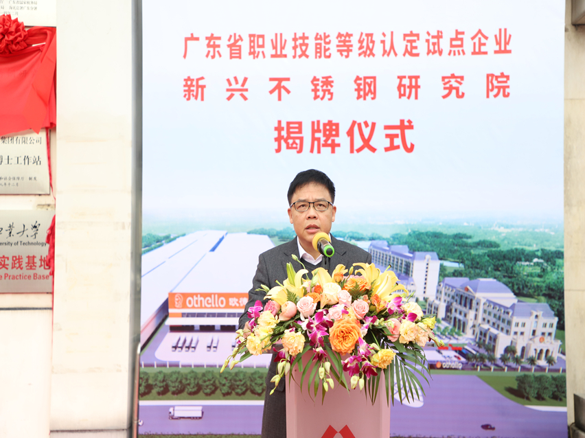 萬事泰集團執(zhí)行總裁劉炳耀首先向在百忙中抽空出席本次儀式的領(lǐng)導(dǎo)、嘉賓表示歡迎和感謝。他表示,“順利申報成為廣東省職業(yè)技能等級認定試點企業(yè),以及成立新興不銹鋼研究院是萬事泰集團向著高質(zhì)量發(fā)展的兩項重要標志。作為云浮唯一的職業(yè)技能等級認定試點企業(yè),我們將持續(xù)加強認定工作的科學化、規(guī)范化,進一步提升企業(yè)技能人才的水平,助力云浮、新興的技能人才隊伍建設(shè)發(fā)展。同時,承載著各級領(lǐng)導(dǎo)和社會各界的支持、關(guān)懷,新興不銹鋼研究院落戶萬事泰集團,這是對萬事泰研發(fā)實力的認可,也是對萬事泰的期望,我們將以此為鞭策,充分發(fā)揮研究院的能動性,加快企業(yè)創(chuàng)新升級,以點帶面,促進行業(yè)的創(chuàng)新發(fā)展,為新興不銹鋼餐廚具產(chǎn)業(yè)的轉(zhuǎn)型升級凝聚核心競爭力作出積極貢獻?!?