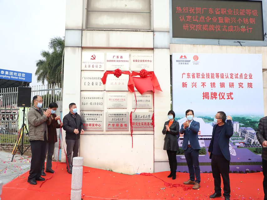 集團訊 1月22日上午,萬事泰集團舉行了廣東省職業(yè)技能等級認定試點企業(yè)暨新興不銹鋼研究院揭牌儀式。云浮市科學技術(shù)局、市人力資源和社會保障局與新興縣人民政府等機關(guān)單位領(lǐng)導(dǎo),新興縣不銹鋼商會及其會員企業(yè)代表共同見證了這富有意義的時刻,萬事泰集團董事長梁桂泉、執(zhí)行總裁劉炳耀等集團領(lǐng)導(dǎo)出席了儀式。儀式由新興不銹鋼研究院院長陳健主持。萬事泰集團中心級部門負責人參加活動。