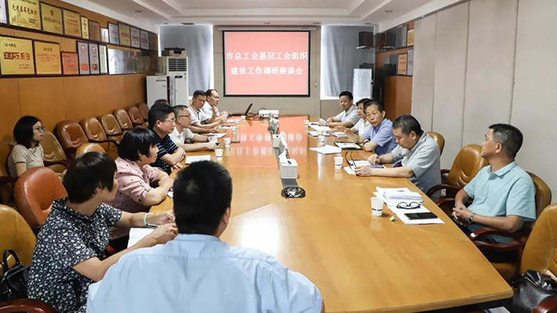 6月16日,云浮市人大常委會副主任、市總工會主席黃漢棣率市總工會正副主席一行在新興縣人大副主任、縣工會主席黃偉勝的陪同下,蒞臨萬事泰集團調(diào)研基層工會組織建設(shè)工作,萬事泰集團副總裁劉炳耀、行政部總監(jiān)陳永錦、工會主席梁洪光接待并參加調(diào)研座談。