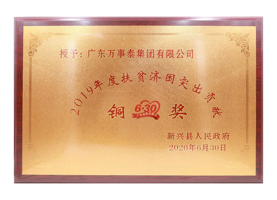 為響應2021年廣東省扶貧濟困日活動的號召,萬事泰集團積極參與“扶貧濟困日”活動,被縣政府授予2020年度扶貧濟困突出貢獻銅獎。