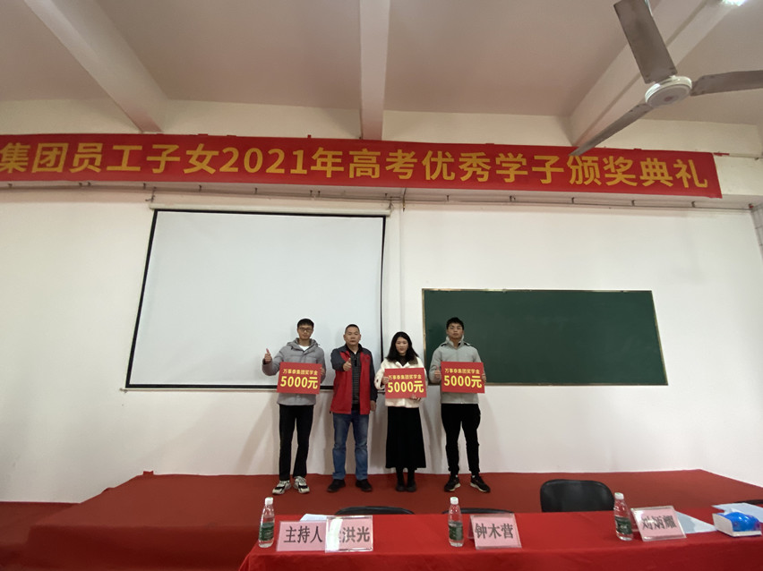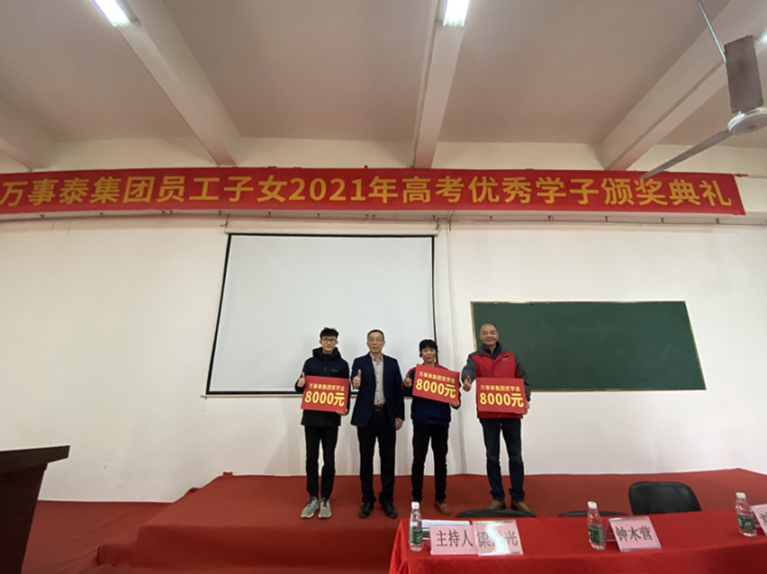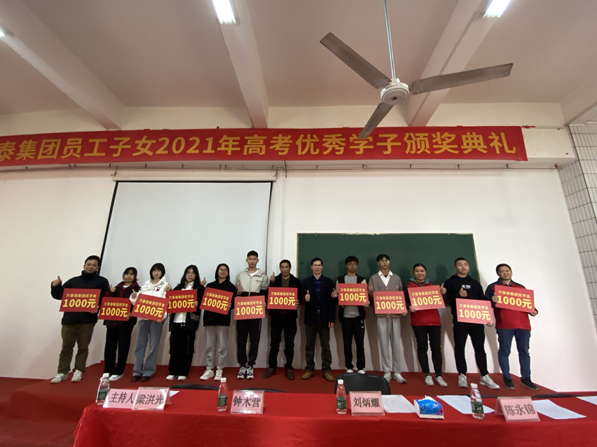 頒獎(jiǎng)典禮由黨支部書記、工會(huì)主席梁洪光主持,人力資源部主管區(qū)冠文宣讀《萬事泰集團(tuán)關(guān)于員工子女獎(jiǎng)學(xué)辦法》及獎(jiǎng)學(xué)決定,陳永錦總監(jiān)、梁洪光書記為23名普通本科高校學(xué)子頒發(fā)每人1000元獎(jiǎng)學(xué)金,鐘木營總經(jīng)理為211高校學(xué)子頒發(fā)每人5000元獎(jiǎng)學(xué)金,劉炳耀執(zhí)行總裁為985高校學(xué)子頒發(fā)每人8000元獎(jiǎng)學(xué)金。