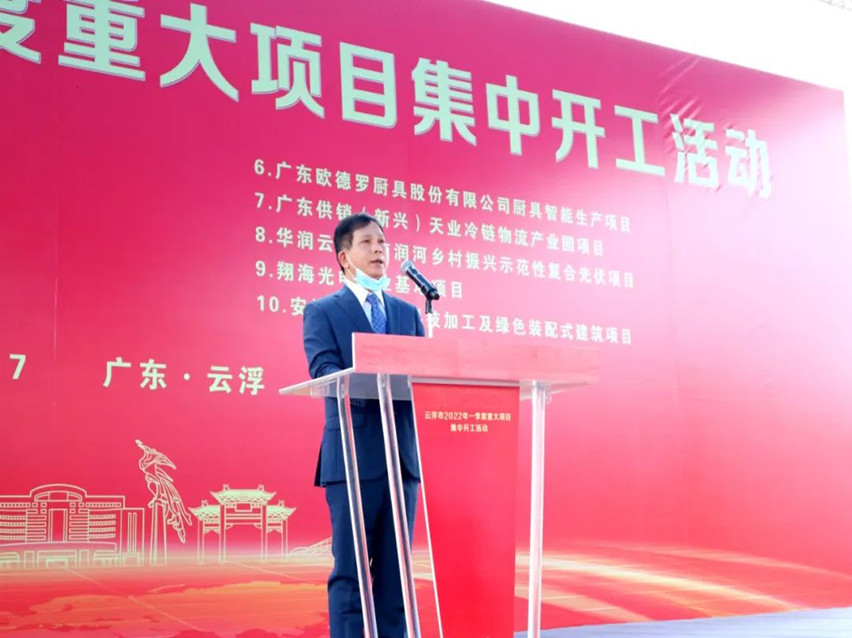 集團訊 2月17日上午,云浮市2022年第一季度重大項目集中開工活動隆重舉行,廣東歐德羅廚具智能生產(chǎn)項目與翔海光電產(chǎn)業(yè)基地項目等10個項目共同在新興縣新成工業(yè)園東園舉行集中開工儀式。廣東歐德羅廚具股份有限公司董事長梁桂泉作為歐德羅廚具智能生產(chǎn)項目代表出席參加活動并上臺發(fā)表講話。