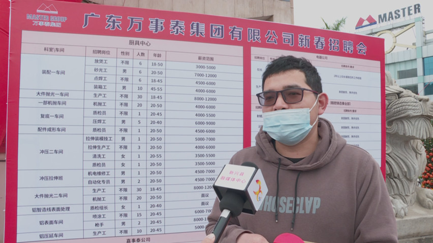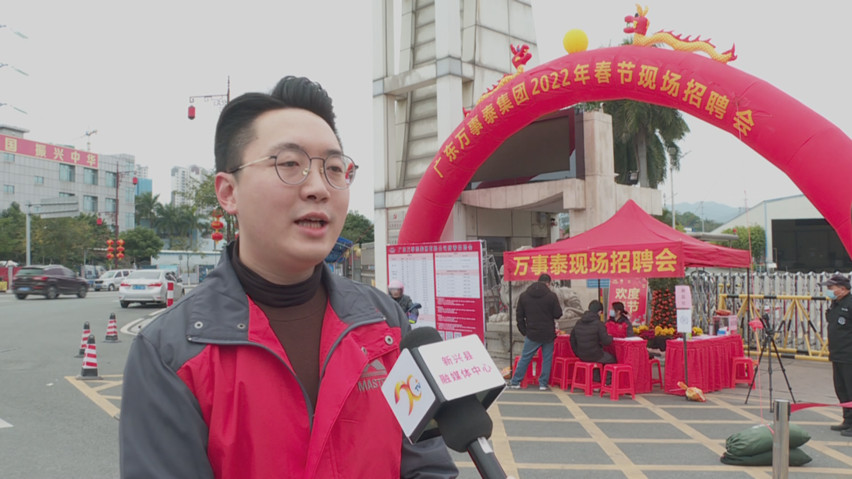 區(qū)冠文 廣東萬事泰集團人力資源部主管:應聘者可到招聘攤位進行咨詢,尋找合適的崗位,在工作人員的指導下填寫完整應聘履歷表后,由用人部門帶領應聘者先觀察工作的環(huán)境以及工作內(nèi)容,得到應聘者的認可后,再進行相關的面試流程,面試通過后只需要準備入職資料即可馬上辦理入職手續(xù)。我們想借助本次招聘,告訴外出工作的同鄉(xiāng)們,遠在他鄉(xiāng)漂泊不如留在當?shù)匕l(fā)展,廣東萬事泰集團海量高薪職位等著各位同鄉(xiāng)們的到來。