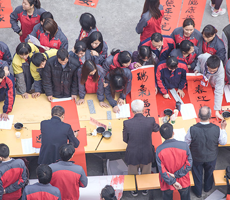 從上午10點(diǎn)鐘開始至下午13:30分,書法家們沒(méi)有片刻休息,水也沒(méi)有喝上一口,歷時(shí)三個(gè)多小時(shí),現(xiàn)場(chǎng)揮毫潑墨,飽含激情為員工書寫了近五百多幅春聯(lián)。